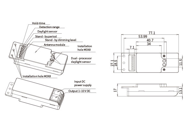 Model name:HNS102 12V microwave sensor, 1-10V DC output , tri-level dimming control motion sensor